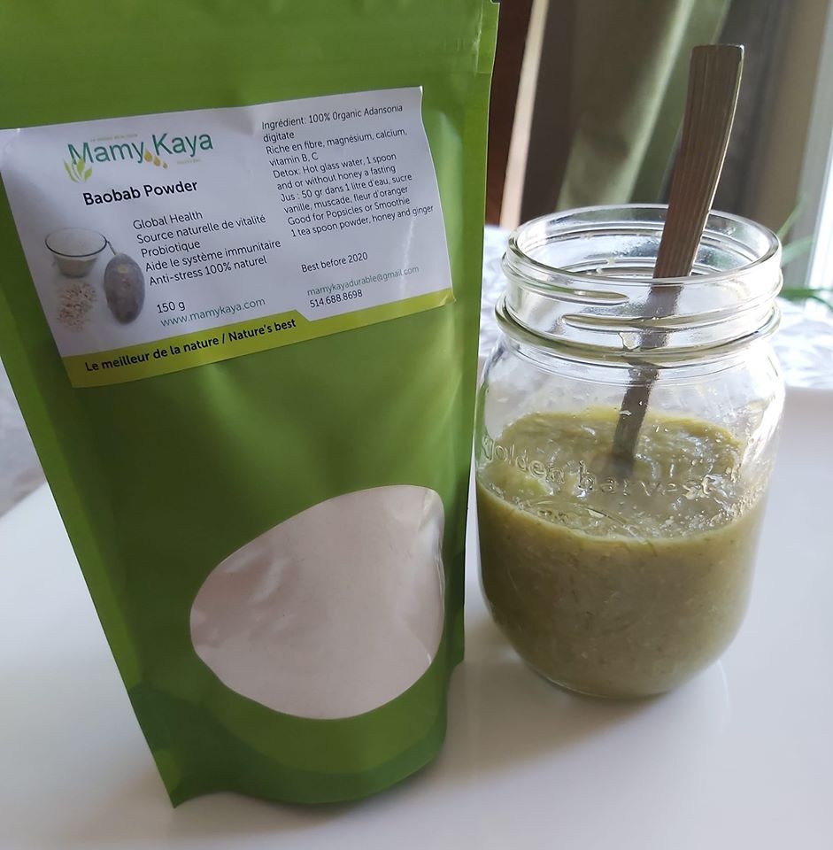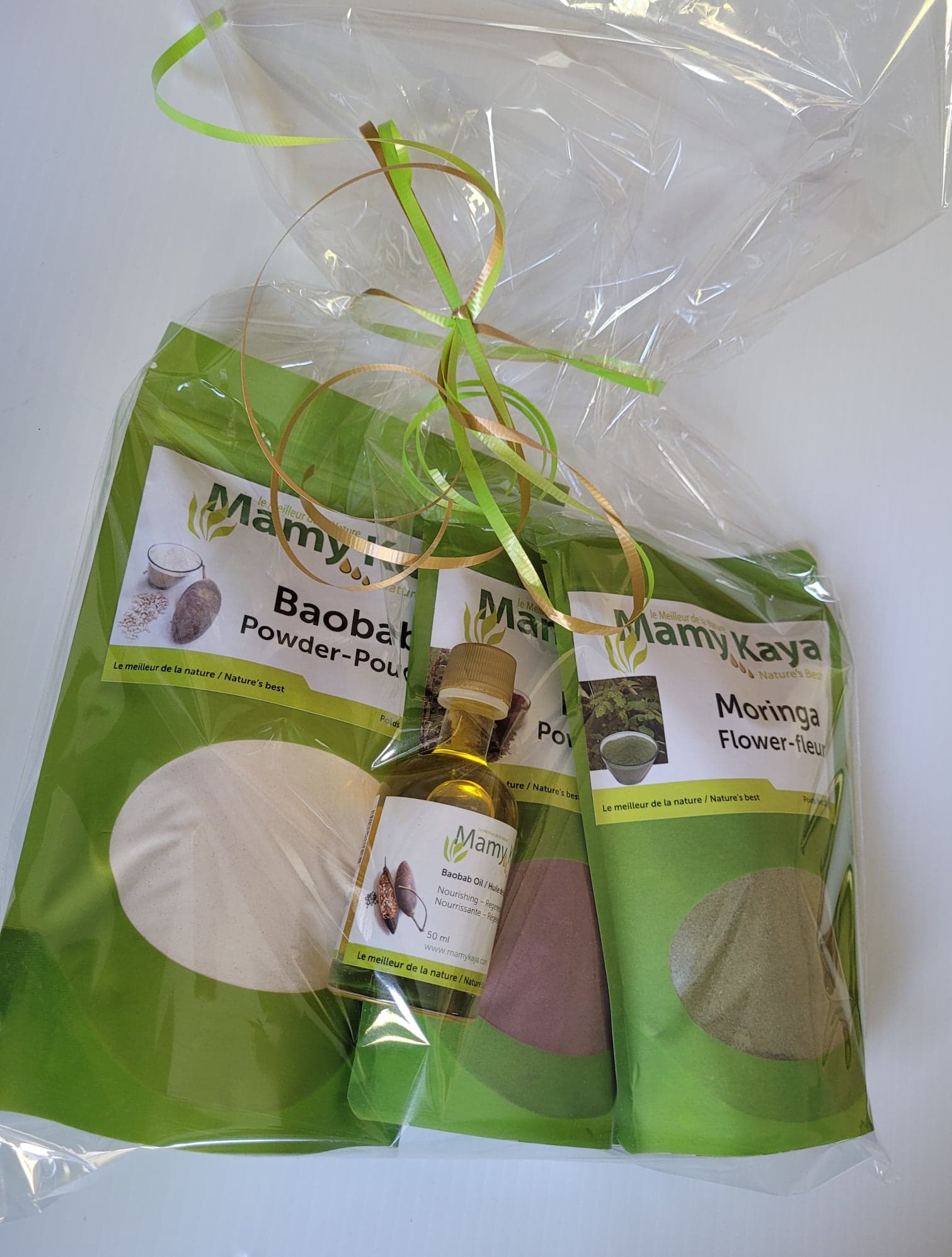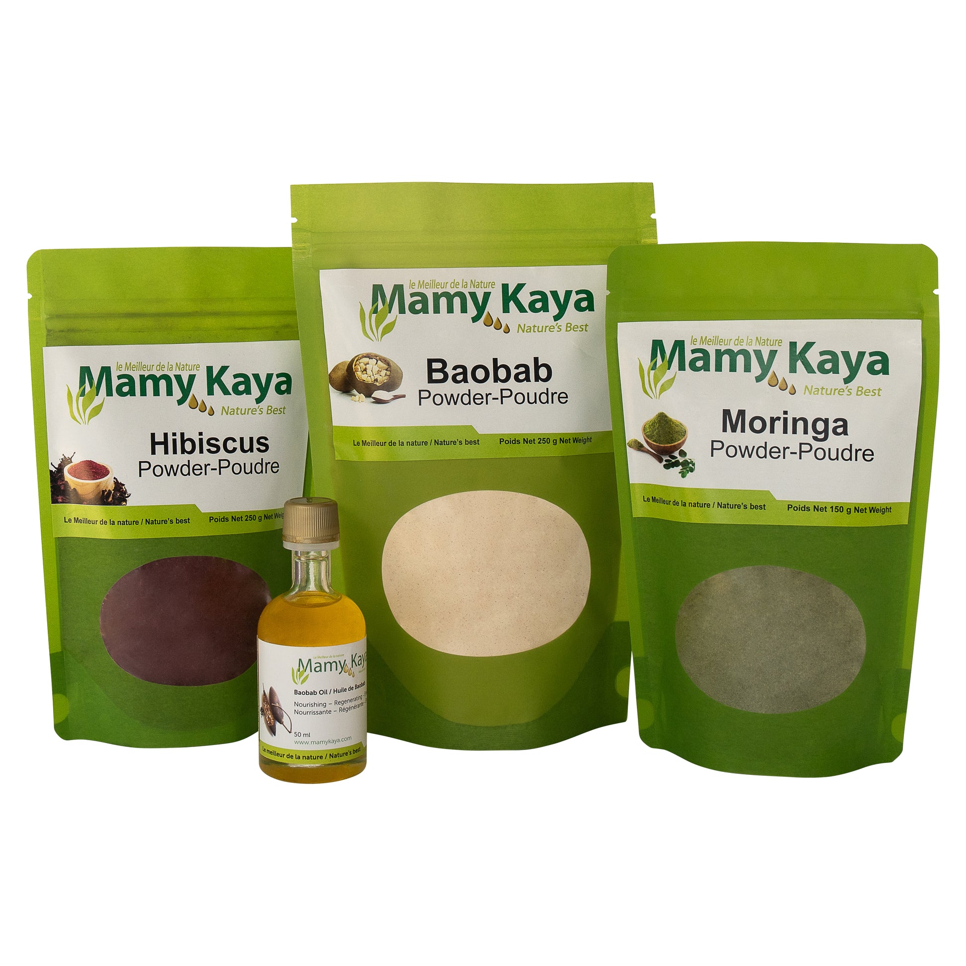 Dans le bouquet Mamy Kaya , vous avez un peu de poudres baobab, d'hibiscus et de moringa et des huiles précieuses d'Afriques naturelles pressées à froid riches en vitamines et minéraux.
