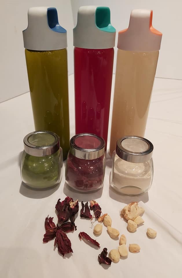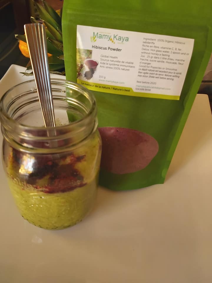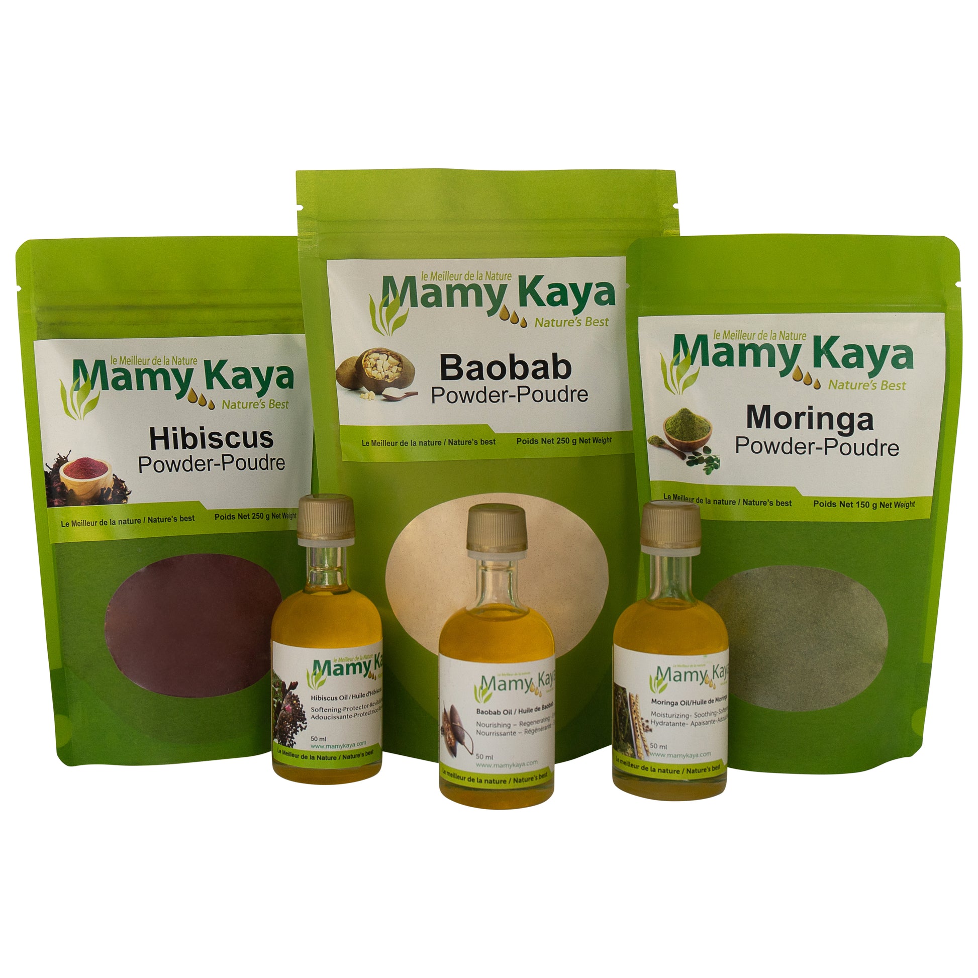 Dans le bouquet Mamy Kaya , vous avez un peu de poudres baobab, d'hibiscus et de moringa et des huiles précieuses d'Afriques naturelles pressées à froid riches en vitamines et minéraux.